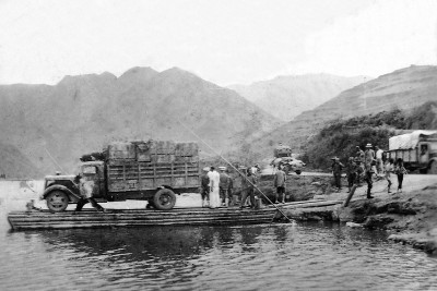 1938年故宫文物西迁时,木船载文物卡车过河 资料图片